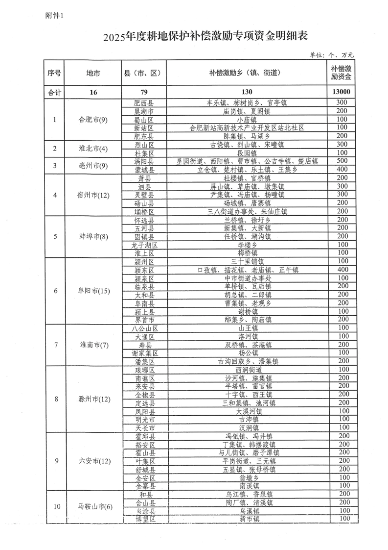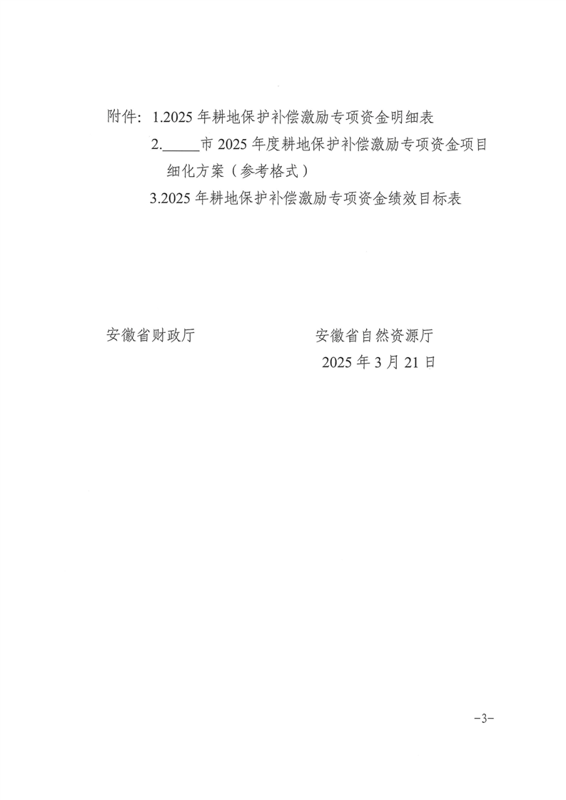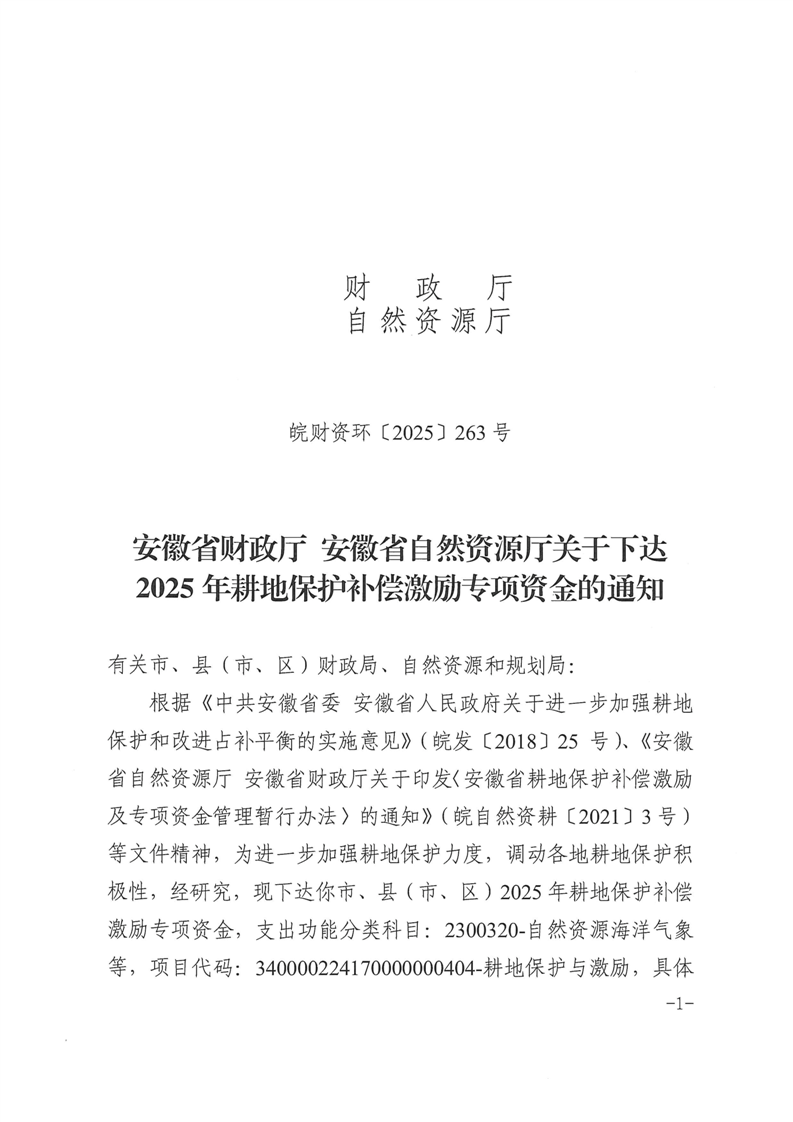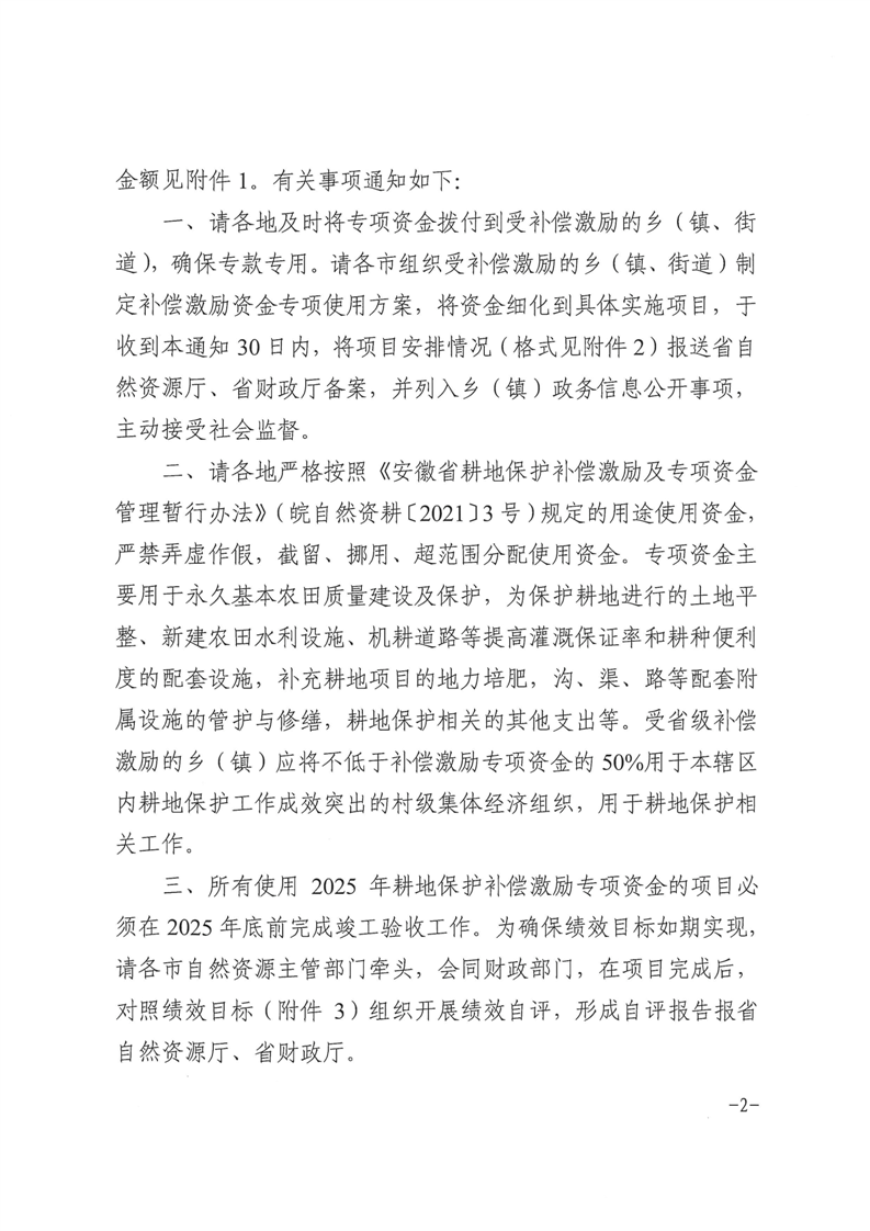 安徽省财政厅 安徽省自然资源厅关于下达2025年耕地保护补偿激励专项资金的通知
